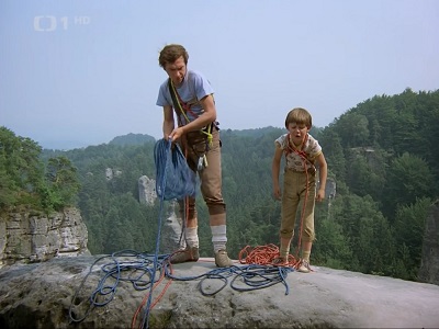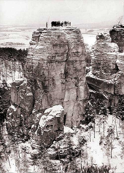Sápeme se rychle nahoru po ledovatém pískovci, ruce si rozdíráme o hrubé výčnělky, ale je to fajn! Za svítání jsme nahoře, podáváme si pravice a rozhlížíme se po fantasticky krásné scenérii Českého ráje: zimní bílé louky v mlhách, v dálce z nich vystupují jen Trosky a Kozákov, v zasnežených borech truní Valdštejn a Hrubá Skála.