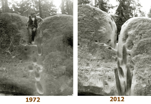 Jsou věci a místa, které nemusí znát každý. Už tak se to i mimo hlavní stezky hemží turisty a spousta skal je na spadnutí. Proto musíme alespoň těch pár skrytých míst chránit. Pro ukázku dobře poslouží známý kámen ze Sahary, který se za 50 let turismu hodně změnil. Fotka z: Hruboskalské Pěšinky.